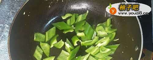3另起锅烧油,放入青椒进去翻炒,稍微炒一下即可。