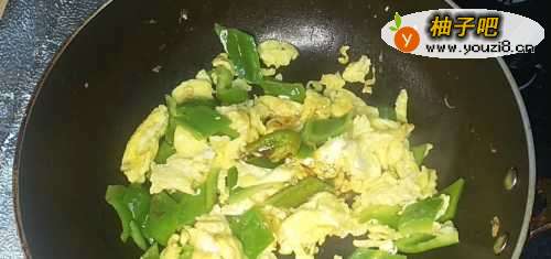 2、起锅烧油放青椒和鸡蛋,再放调料炒匀即可。