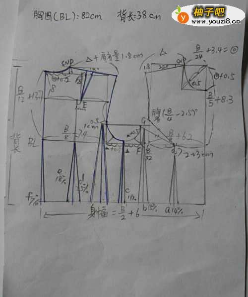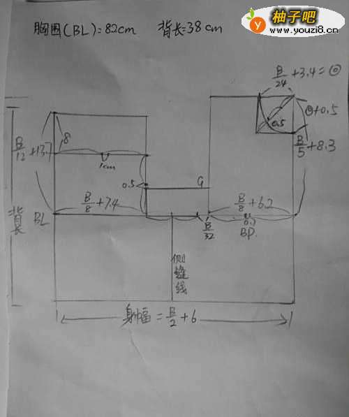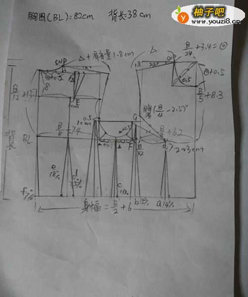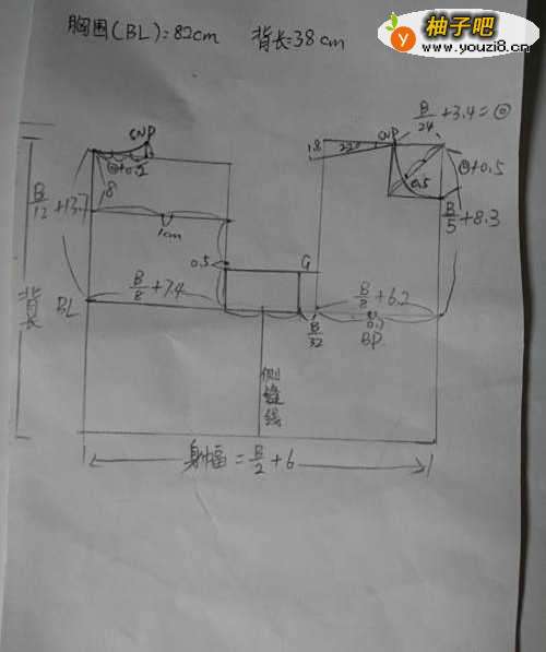 4先计算B/32,由胸宽线向左画出得出来的数值的长度。