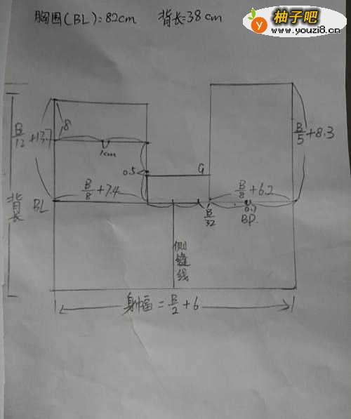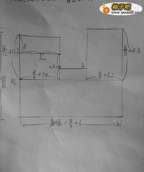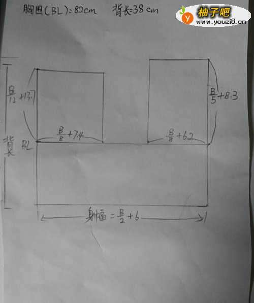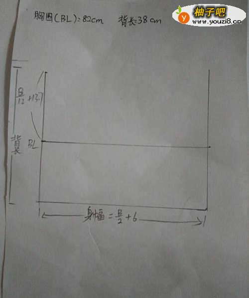 首先画身幅(B/2+6)、背长,然后画胸围水平线B/12+13.7,这个公式得出来的数值就是胸围水平线的位置。