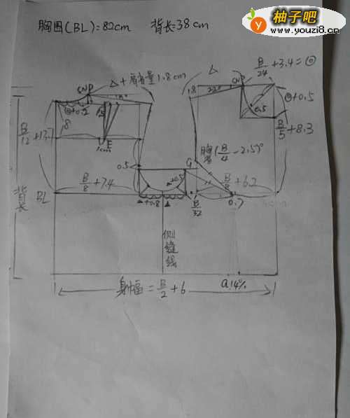 胸省则通过G点来画下面的线,省尖在BP点上,省道的大小为(B/4-2.5)度。