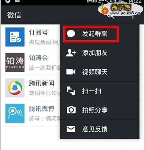 第一步:打开微信进入聊天界面后点击右上角“+”选择“发起群聊”