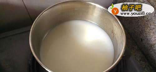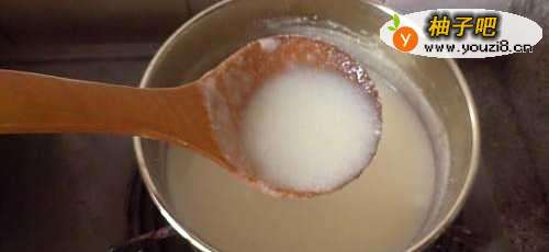 3将搅拌好的杏仁浆直接倒入锅中,加入冰糖煮沸,期间一定要不停搅拌,以防粘锅。