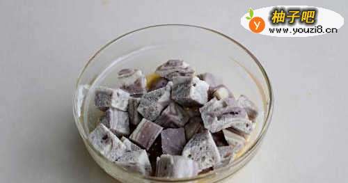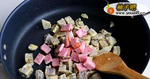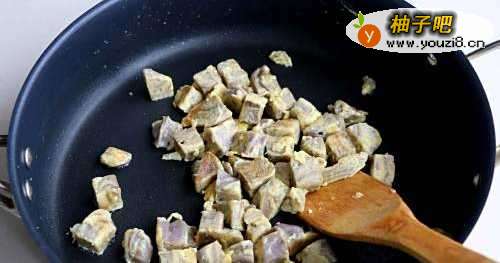 4锅内放入适量的色拉油,烧热后,放入沾有蛋液的馒头块,翻炒至蛋液凝固;