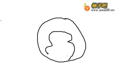 首先,我们先画猴子的脑袋,画一个圆,里面画一个葫芦形状作为脸庞。