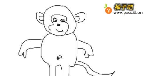 6画完四肢,我们记下来给猴子画上肚脐和尾巴,这样一只完整的小猴子就画好了。