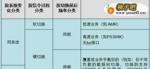 分别从切换前后系统是否变化,信令流程过程以及切换前后频率是否相同进行分类,当发生切换的两个小区使用同一个频点时: