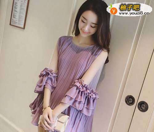七分喇叭袖的设计,给这件衣服增加了点缀, 雪纺的面料,穿在身上轻柔,清爽,短款宽松的版型,不挑身材,内穿一条打底裤就OK了,非常清新简单的装扮,甜美淑女风格。