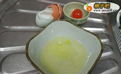 2打开咸蛋取出蛋黄,咸蛋白及鸡蛋白用叉充分调匀备用