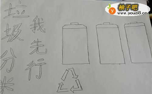 3提好标题后,我们再来从标题中间的一侧开始画三个形状相同并排着的垃圾桶。