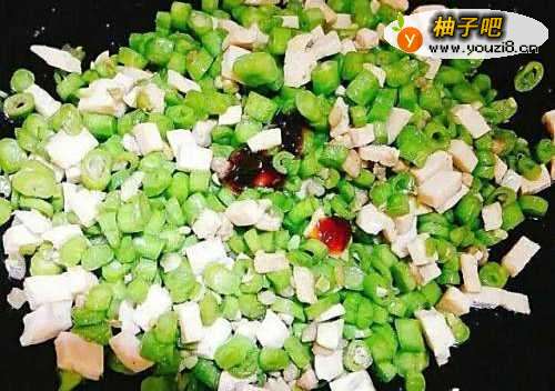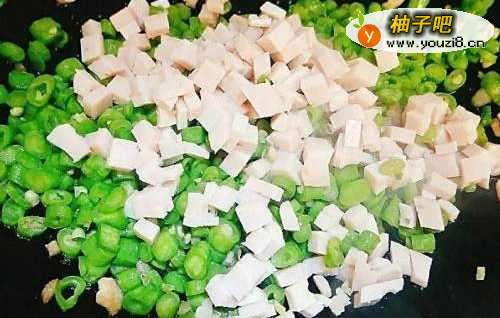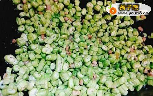 5豆角爆炒熟后下入肉糕粒翻炒。