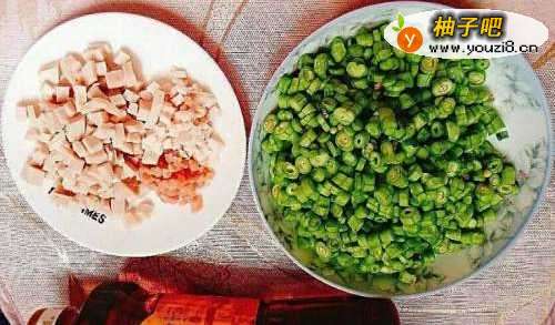准备好猪肉粒,肉糕,豆角切粒。