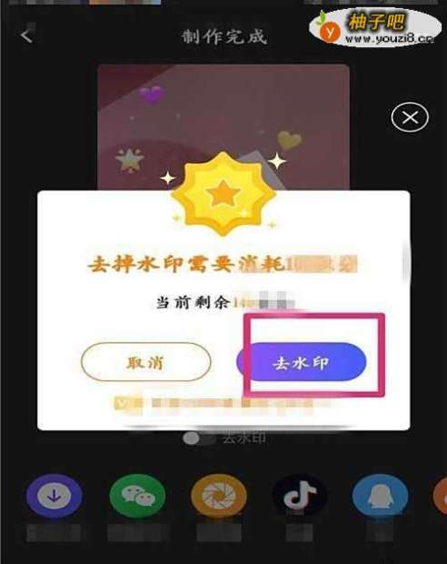 6制作好的视频有水印,点击下方的去水印,然后会弹出对话框提示你需要消耗积分,点击确定,水印就去掉了。