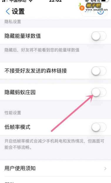 4在打开设置页面中找到隐藏蚂蚁庄园选项选择“白色的状态”按钮