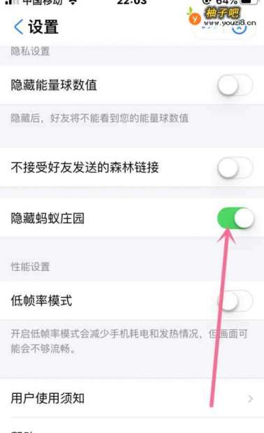 5此时确保隐藏蚂蚁庄园选项中为“浅绿的状态”按钮