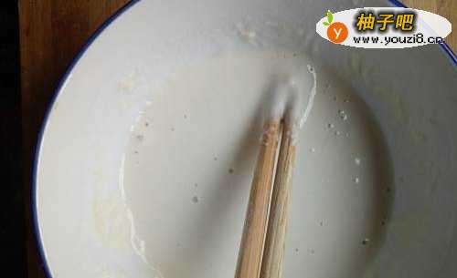 3在放有面粉的碗内倒入适量的冷水,边倒边搅拌,成糊状。