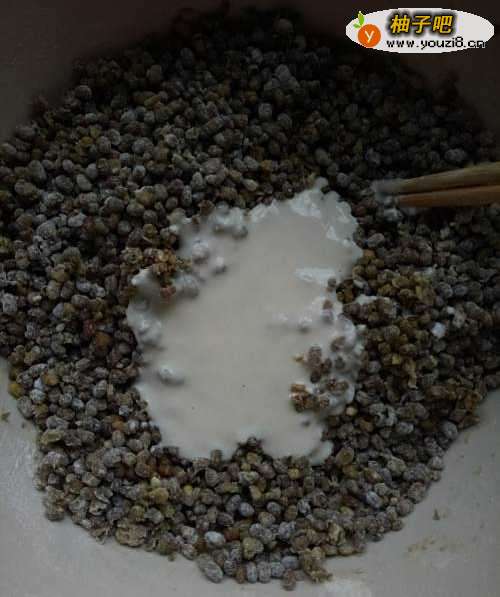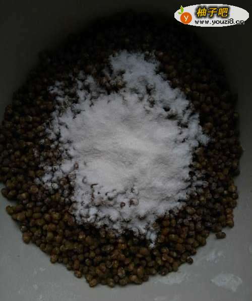 2向蒸好的绿豆内倒入适量的白砂糖、白面粉搅均,成颗粒状时刚刚好。
