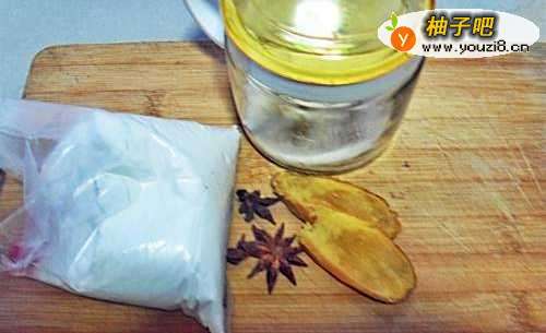 3准备适量的姜片,大料,小苏打和盐放进锅里。(小苏打和盐是为了使豌豆荚的颜色鲜绿,好看。)。