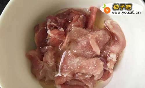 2这里要把猪肉腌一下,把猪肉放入碗里,放入盐,油和淀粉,抓均匀,腌15分钟左右。