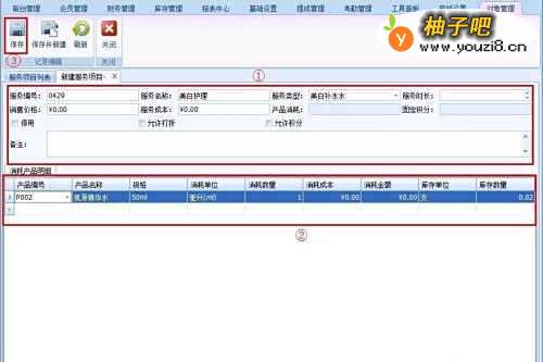 ①把服务编号、名称、类型、时长、销售价格等信息选择填写;