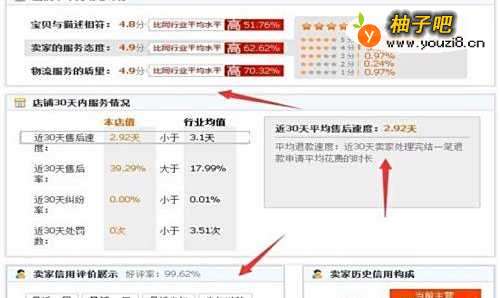 首先说下天猫店铺DSR信用,可以看到这个卖家当前保证金余额5万,是天猫最低保证金要求,店铺半年内动态评分是4.7-4.8也就是说还可以正常,如果是看到4.6以下就是差了,说明整体店铺宝贝物流服务多不怎么样,退款时间是3.10天有点慢算正常,这是平均时间 不是每次处理的时间,要是4天以上就不好了,这多是整店DSR信用的成交销量评分处理的平均大概情况分析。