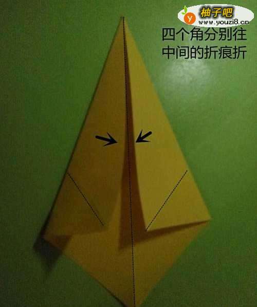 2然后分别将四个角往中间的折痕折,折好后再摊开