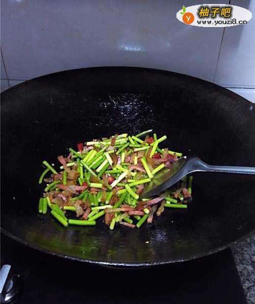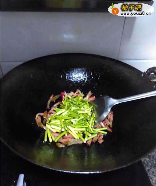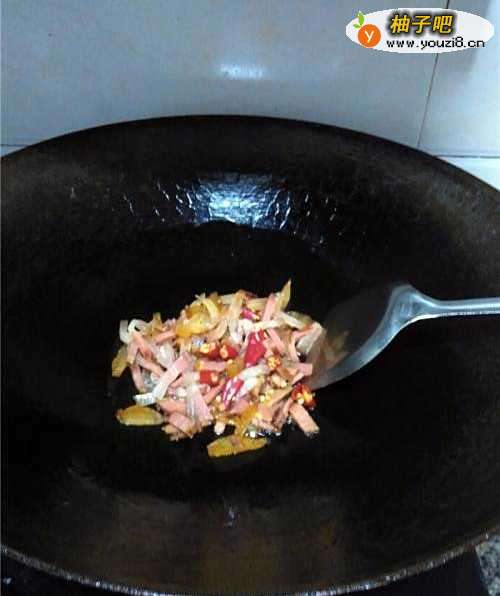 6放入腊肉翻炒出油份,再放入小米辣继续翻炒。