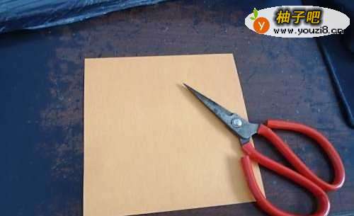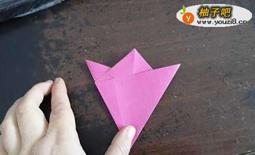 首先准备好彩纸和剪刀,把彩纸的两角对折,如图二。然后以底边的中点为圆心,把左角向右折三分之一,如图三。