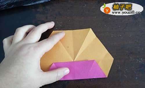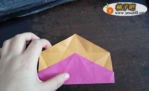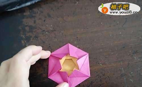 4接下来,再把每个角向着顶上的交点对折,如图二。然后翻到另一面,把中间的正六边形折一下,把每条边向内折如图四。