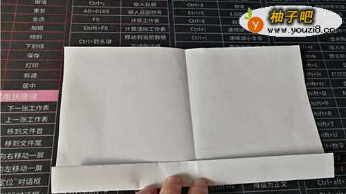2把下侧的边上折,如图一。再把纸翻到另一面,如图二。
