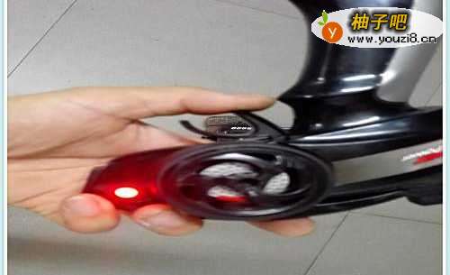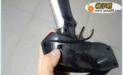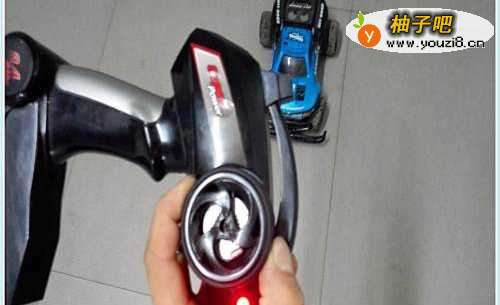 如图所示,大家在遥控器控制开关手柄处会发现有个弯刀状的塑料按钮,往左掰车辆向前走,往右掰,玩具车往后走。