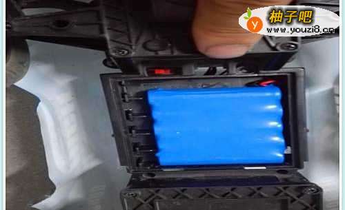 如图所示,在电池的外围有一个小黑色的塑料板,大家将小塑料黑板卡好,然后用小十字改锥将边上的一条螺丝固定好,这样遥控小汽车的电池就不会脱落了。