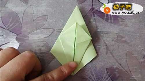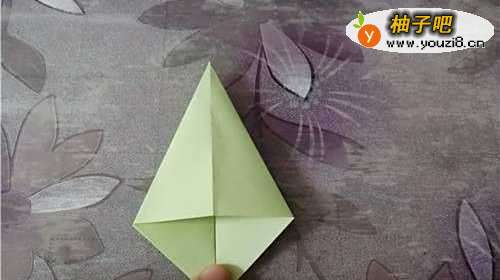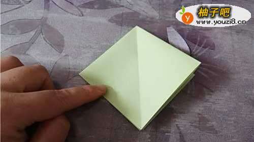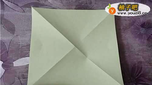 首先把彩纸的对角线对折,翻到另一面,再把中线对折,如图所示。