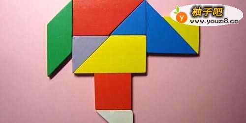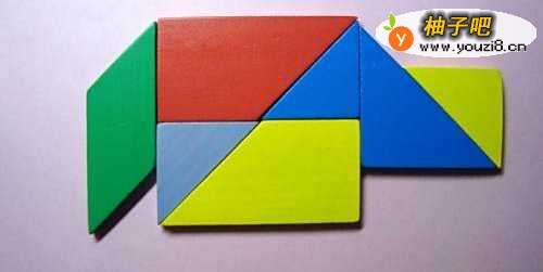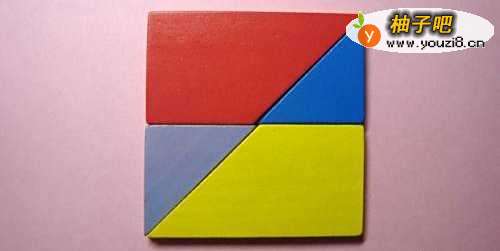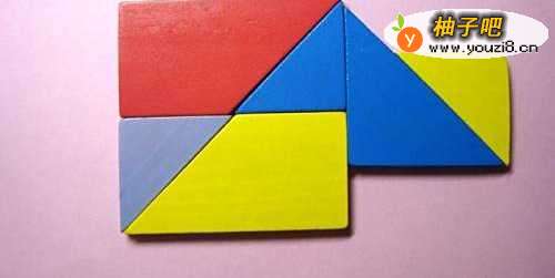 4然后,把蓝色三角形板与橘色的三角形板连接,并摆放在橘色梯形板的右方,拼接位置,如下图所示。