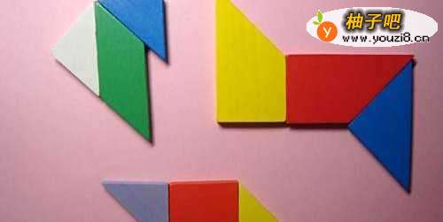 把九巧板准备好,可以每三块拼一个简单图形,先练下手,并数数九巧板的数目是否齐全,如下图所示。