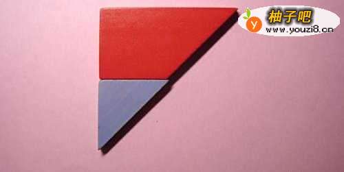 2先取红色的梯形板旋转90度,并把紫色的三角形板连接在红色梯形板的下边,摆放在纸上,拼接位置,如下图所示。