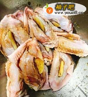 【腌鸡翅】将鸡翅用淘米水洗除腥,在用水洗净,用厨房纸擦干水分,放入料酒、生抽少许、姜片,鸡翅划开口腌制更入味,静置20分钟左右。
