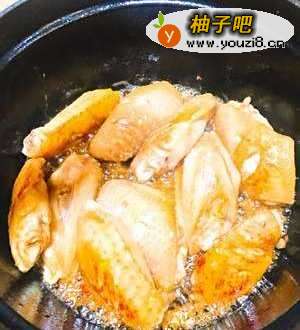 2【煎鸡翅】锅里放油,热锅之后放入冰糖,带冰糖化开后,放入鸡翅,让两面均匀上色。
