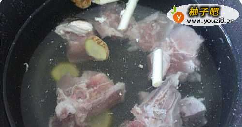 2排骨冷水下锅,放入姜片,,把排骨焯一遍