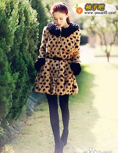 6当然了冬季还是以大衣为主的。动物纹大热的今年,皮草大衣上也不可避免。点点豹纹的皮草大衣可爱调皮。毛线编织的娃娃领与袖口增添了更多的甜美感。下身搭配黑色打底裤配上黑色短靴,显瘦修身很有潮范。