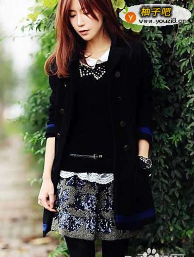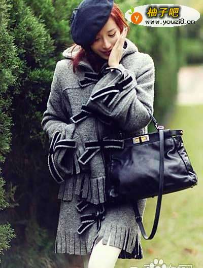 7灰色大衣短裙两件套。灰色包边蝴蝶结与款款流苏变的结合,日系萌点十足。搭配简单的画家帽与黑色包包,可爱甜美。