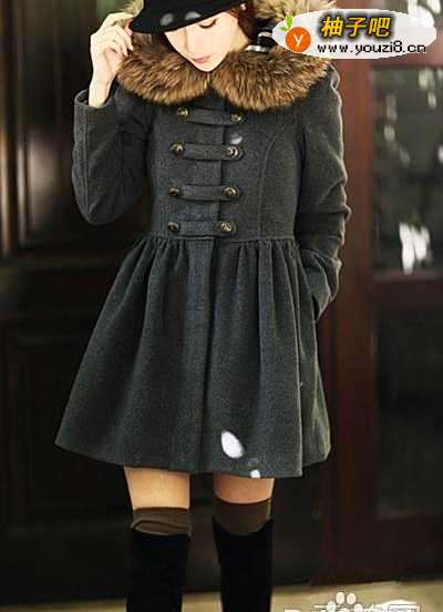 大毛领帽子的外套在今年很流行。裙摆造型的下摆让大衣更有一种女孩的娇媚。下身搭配短裤配上厚裤袜,非常的有型时尚。