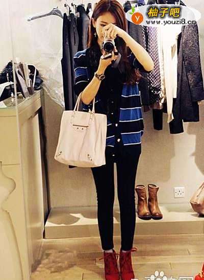4深蓝与宝蓝相间的针织开衫英伦味十足的同时又有点硬朗的感觉。红色的鞋子不失为整身冷色系的搭配增添一丝亮色。