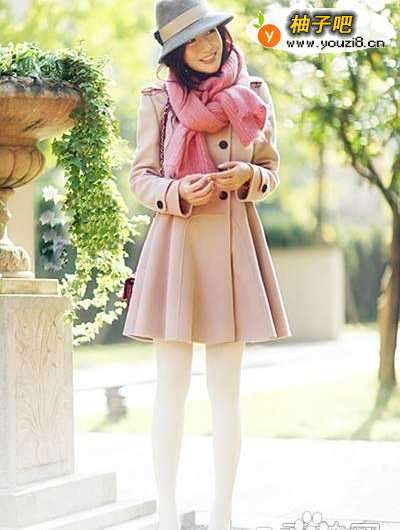 8裙摆式的粉色大衣甜美感十足,搭配灰色复古礼帽与深粉色兔毛围巾,气质大增。下身搭配白色裤袜,很有日系甜美风,淑女气质十足。