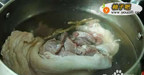3猪蹄洗净之后整块放汤锅里,加冷水,几片姜,适量料酒,把水烧开,再小火煮几分钟,煮出血沫