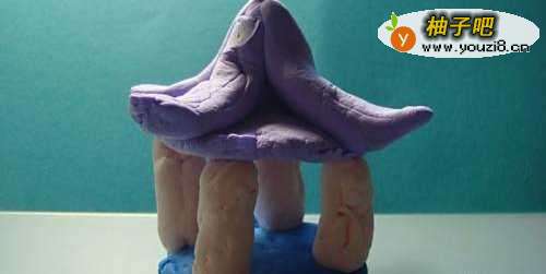 6最后, 把紫色彩泥屋顶安装在圆形柱子的彩泥上,看整体效果,如下图所示。这样一个彩泥漂亮的小亭子就制作好了,大家也来做做吧。
