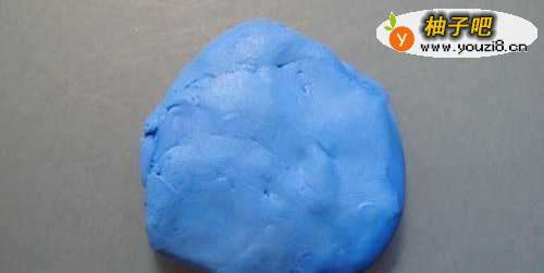 用工具取出蓝色的彩泥,把蓝色的彩泥用手压成圆形,摆放在纸上,如下图所示。