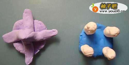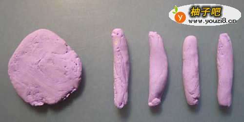 5然后,把紫色长条形彩泥安装在紫色圆形彩泥上,摆放在纸上,如下图所示。