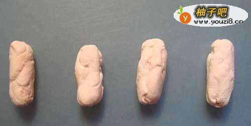 2接着,把白色的彩泥用手揉成四个圆柱形,作为小亭子的柱子,摆放在纸上,如下图所示。