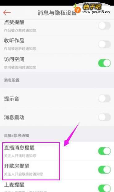 5【消息与隐私设置】也击开后,【直播消息提醒+开歌房提醒】都开了,如图。